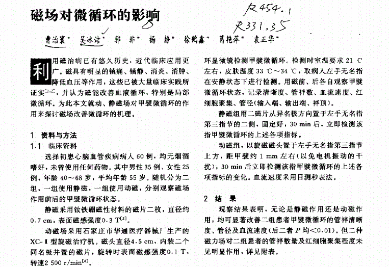 最常见的不畅循环症状包括: • 刺痛 • 麻木 • 在肢体中悸动或刺痛 • 疼痛 • 肌肉痉挛 每一种可能导致血液循环不畅的情况也会引起独特的症状。例如,当血液供应受限时,可能会感到手脚有麻木感,也可能出现针脚感。 造成血液循环不畅的原因有多种: 1.外周动脉疾病 外周动脉疾病(PAD)会导致腿部血液循环不畅。PAD是一种导致血管和动脉变窄的循环条件。再一种叫做动脉粥样硬化的相关疾病中,动脉和血管中的斑块积聚导致动脉硬化。这两种情况都会导致血液流向四肢,并可能导致疼痛。 随着时间的推移,四肢的血液流动会减少: • 麻木 • 刺痛 • 神经损伤 • 组织损伤 如果不及时治疗,颈动脉血流量和血小板减少可能导致中风。颈动脉是输送血液到大脑的主要血管。如果斑块积聚在心脏的动脉中,就有心脏病发作的危险。 “PAD”在50岁以上的成年人中最为常见,但也可能发生在年轻人身上。吸烟的人在生命早期就有更高的风险。 2.血凝块 血凝块阻碍血液流动。它们几乎可以在身体的任何地方发展,但是在手臂或腿上形成的血凝块会导致血液循环问题。 由于各种原因,血凝块可能会出现,而且它们可能是危险的。如果腿上的血凝块破裂,它会穿过身体的其他部位,包括心脏或肺。这也可能导致中风。 当这种情况发生时,结果可能是严重的,甚至是致命的。如果在它引起更大的问题之前被发现,就可以成功地治疗血栓。 3.静脉曲张 静脉曲张是由瓣膜失效引起的静脉血管扩张。这些静脉看起来是粗糙的,而且是充血的,而且它们经常出现在腿部的背部。受损的血管不能像其他静脉那样有效地移动血液,因此血液循环不畅可能会成为一个问题。静脉曲张虽然罕见,但也会引起血液凝块。 基因很大程度上决定了是否会患上静脉曲张。如果一个亲戚患有静脉曲张,那么风险就会更高。 4.糖尿病 我们可能认为糖尿病只会影响血糖,但它也会导致身体某些部位的血液循环不畅。这包括腿部抽筋,以及小腿、大腿或臀部疼痛。当在运动时,抽筋可能会特别严重。患有晚期糖尿病的人可能难以发现血液循环不良的迹象。这是因为糖尿病性神经病变能引起四肢的血流量的减少。 糖尿病也会引起心脏和血管问题。患有糖尿病的人罹患动脉粥样硬化、高血压和心脏病的风险增加。 5.肥胖 超重会给身体带来负担。如果超重,坐着或站着好几个小时可能会导致循环问题。也会增加其他导致血液循环不畅的原因,包括静脉曲张和血管问题。 6.雷诺氏病 患有慢性感冒的人可能患有一种叫做雷诺氏病的疾病。这种疾病会导致手和脚趾的小动脉变窄。狭窄的动脉在身体里供血不足,所以可能会开始出现血液循环不畅的症状。雷诺氏症的症状通常发生在寒冷的温度或感到异常紧张的时候。 身体的其他部位也会受到影响,除了手指和脚趾。有些人的嘴唇、鼻子、乳头和耳朵都会出现症状。 女性更有可能患上雷诺氏症。而且,生活在寒冷气候下的人更有可能患此病。 对血液循环不畅的治疗取决于引起它的条件。 方法可能包括: • 穿弹力短袜; • 用ANRM技术从脑下手,进行自律神经的功能重塑,增加对血液循环的调控; • 医生推荐的特殊锻炼计划,以增加血液循环; • 胰岛素治疗糖尿病; • 激光或内镜静脉手术治疗静脉曲张; 药物可能包括溶栓药物,以及血液稀释剂,取决于身体状况。阿尔法阻滞剂和钙通道阻滞剂用于治疗雷诺氏症。 当血管面临危机之时,我们的身体会“说话”,而我们所能做的就是尽量不给血管“添堵”。 除了健康的饮食习惯,我们也要学会从根源出发,保持血管健康、减缓血管老化! 更有效的治疗血液循环不畅的方法,在于预防。用磁疗预防血管堵塞,是您更佳选择!磁疗加速血液循环的作用,在实验中已经得到验证。 图:《磁场对微循环的影响》文章 实验发现:通过静磁场作用于甲襞,可以清楚地看到甲襞微血管清晰度明显增加。 另外磁场刺激末梢神经感受器,反射地引起血管扩张,血流加速,代谢加强,使模糊的血管袢轮廓变得清晰。同时,甲襞管袢在磁场的作用下,血流速度明显加快。